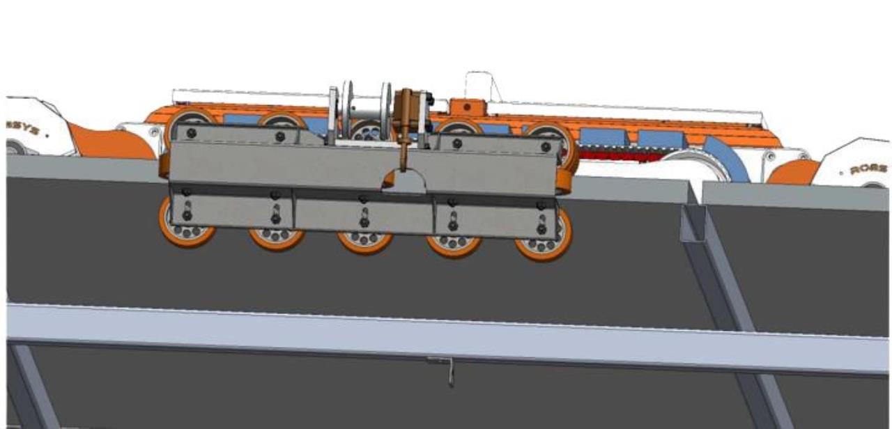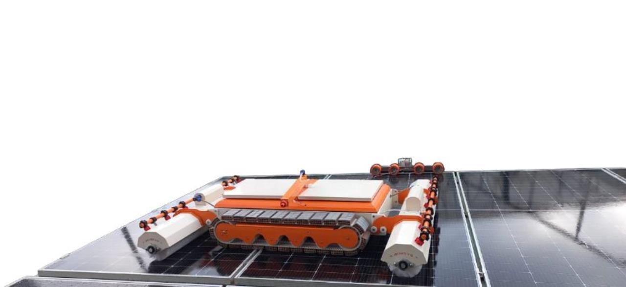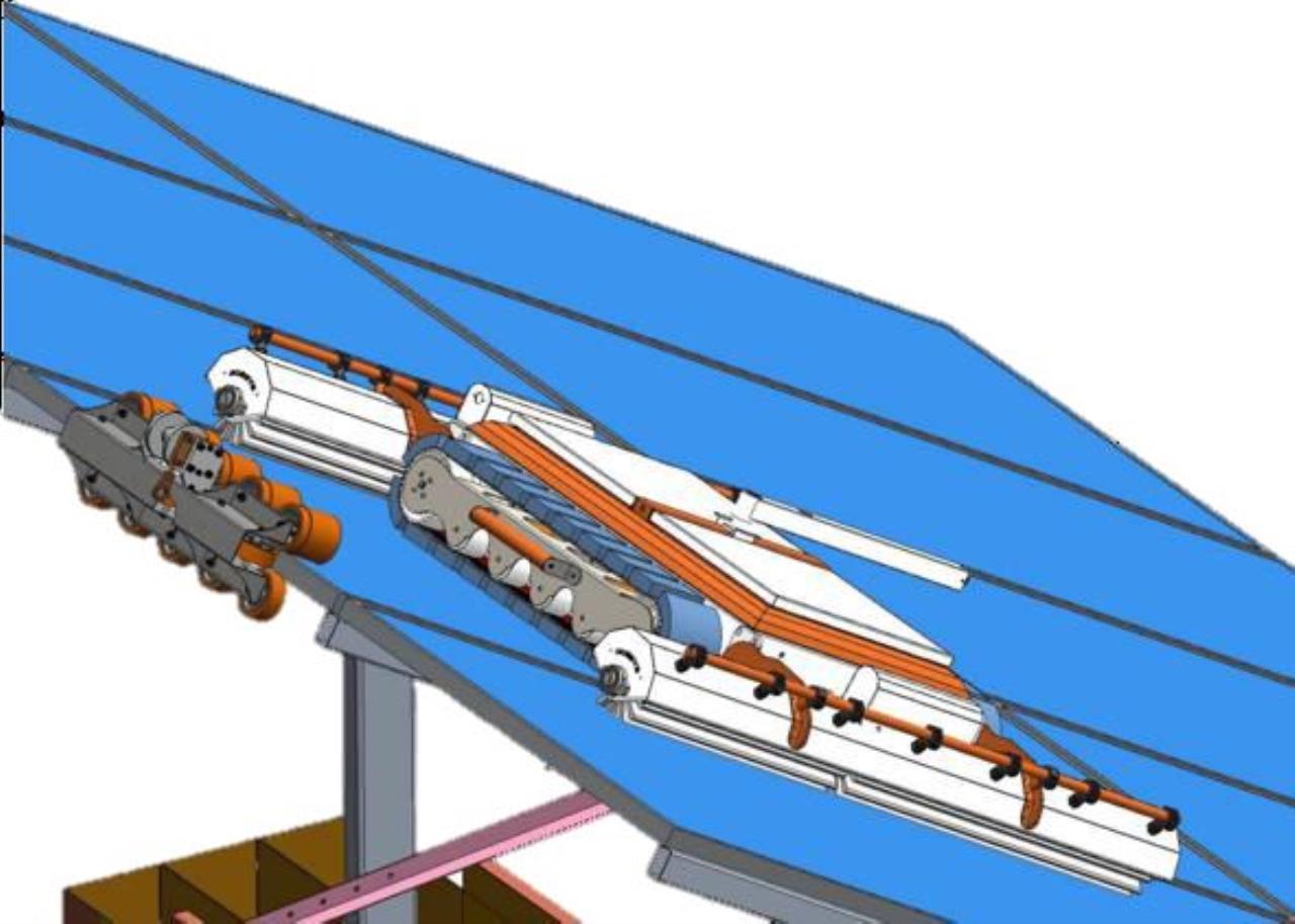 Die Anti-Rutsch Vorrichtung wird oben an den Solarpanels aufgesetzt. Der Reinigungsroboter wird an die Halterung befestigt und fährt parallel mit dem Roboter bei der Reinigung oben als Halterung mit.