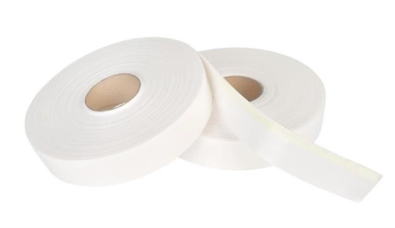 Stuckband aus geschlossenzelligem PE-Schaumstoff mit einseitig selbstklebendem Klebebandstreifen im Randbereich, als Dichtungs-, Dehn- und Abdeckband für den Trockenbau.